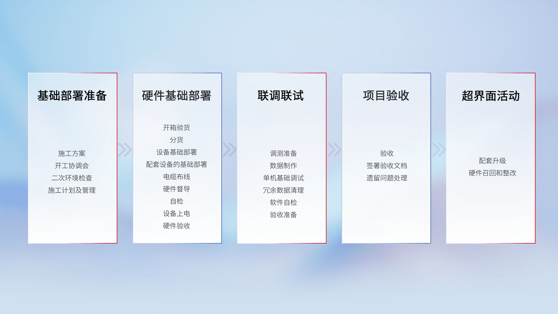 从基础部署准备、、、、硬件基础部署、、联调联试、、项目验收、、、越界面活动的全过程可追溯,,保证施工质量和进度。。。